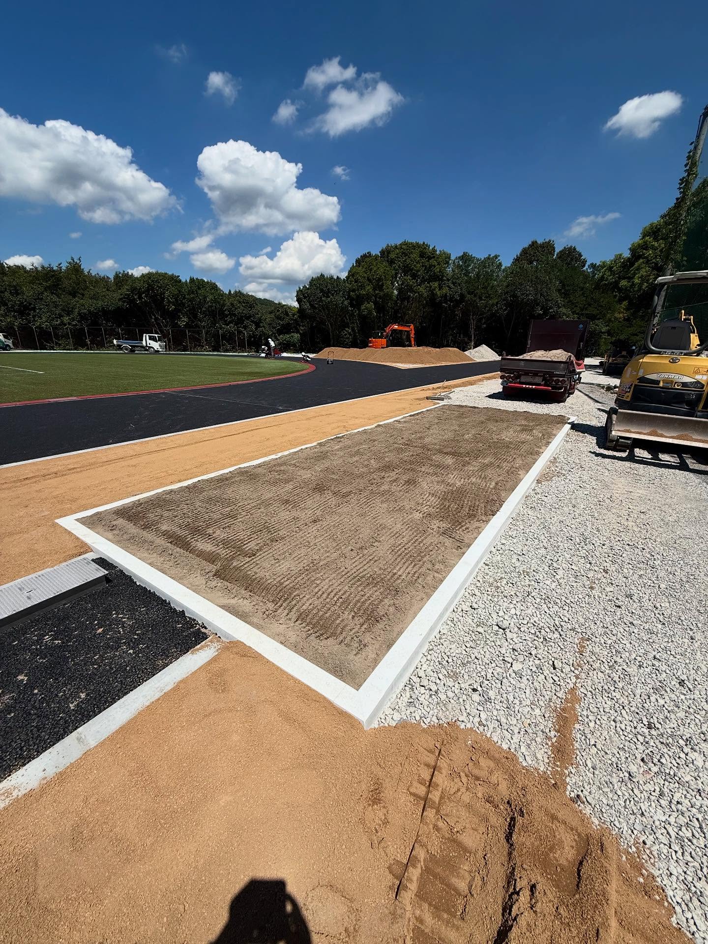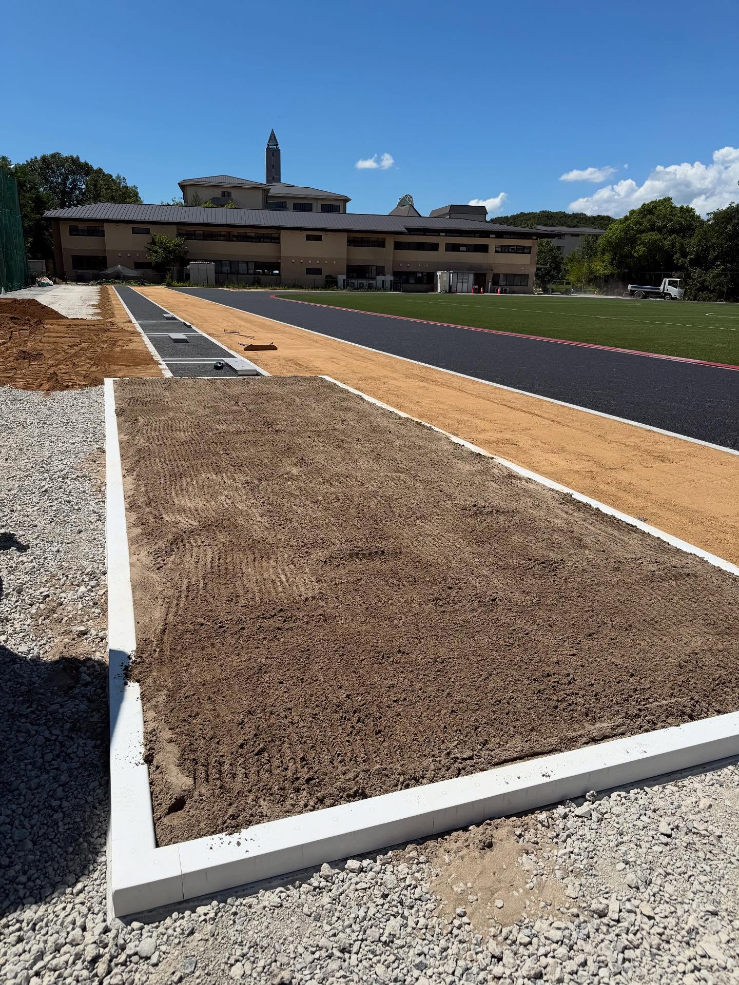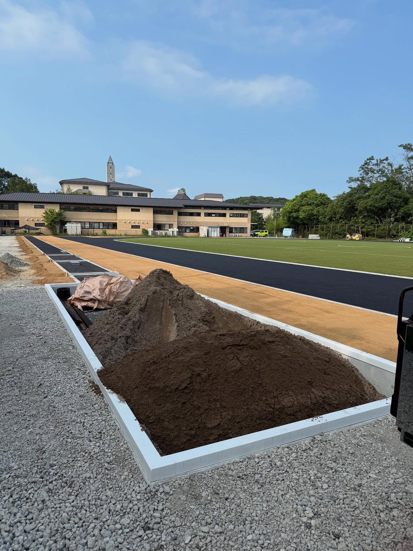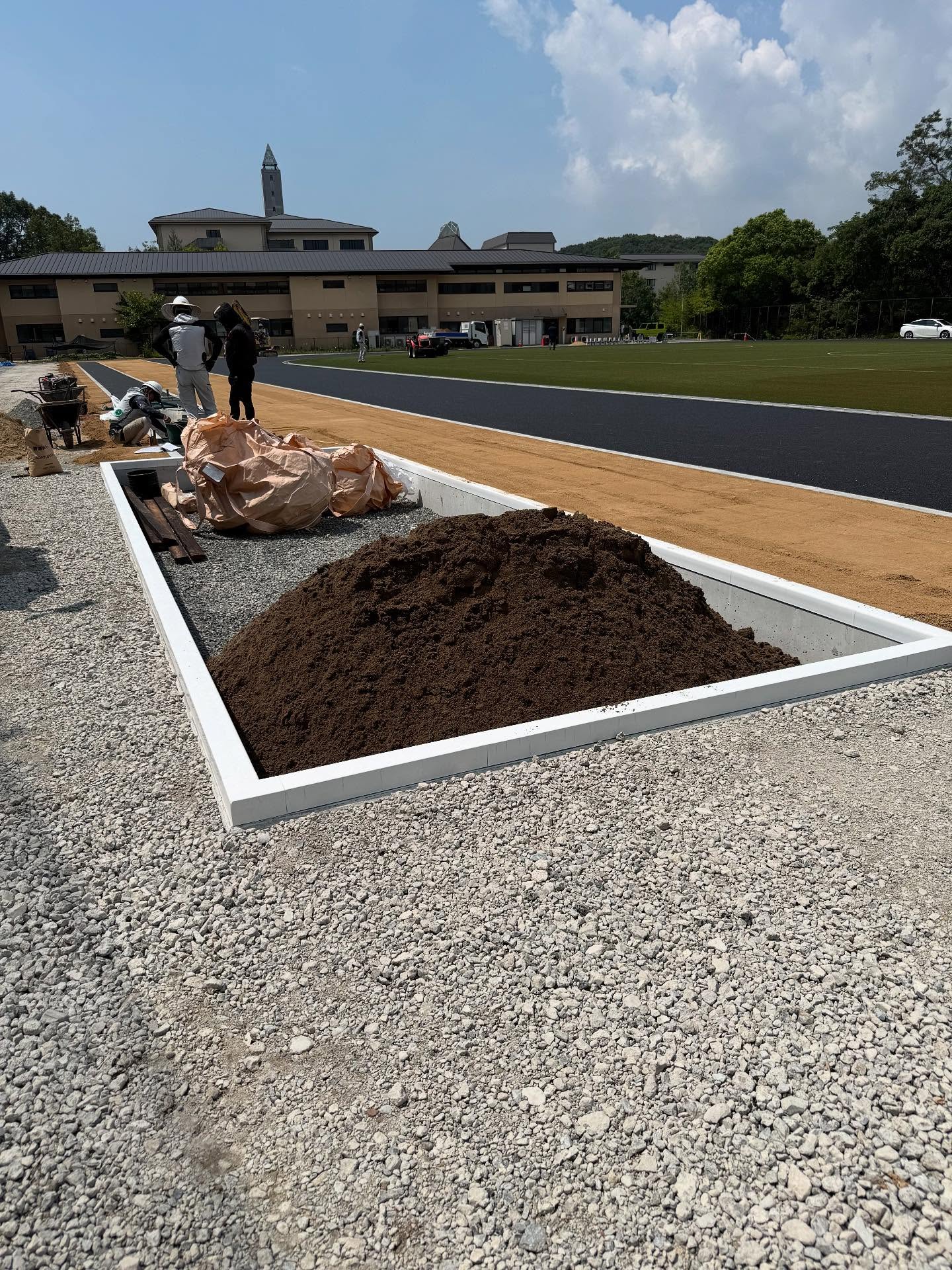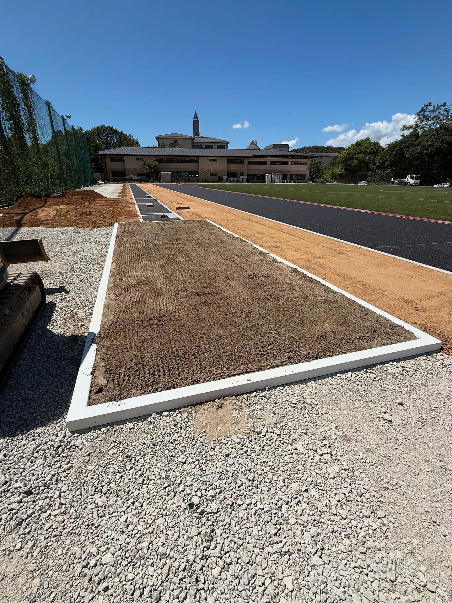 ご依頼いただきありがとうございます。5月に屋根のメンテナンスで来させいただいた時に、作陽高校時代の部活の顧問と偶然お会いできて、グランドと体育館を新しくしているとお聞きし、この時に、ここの砂場に砂を入れてみたいと思っておりました!